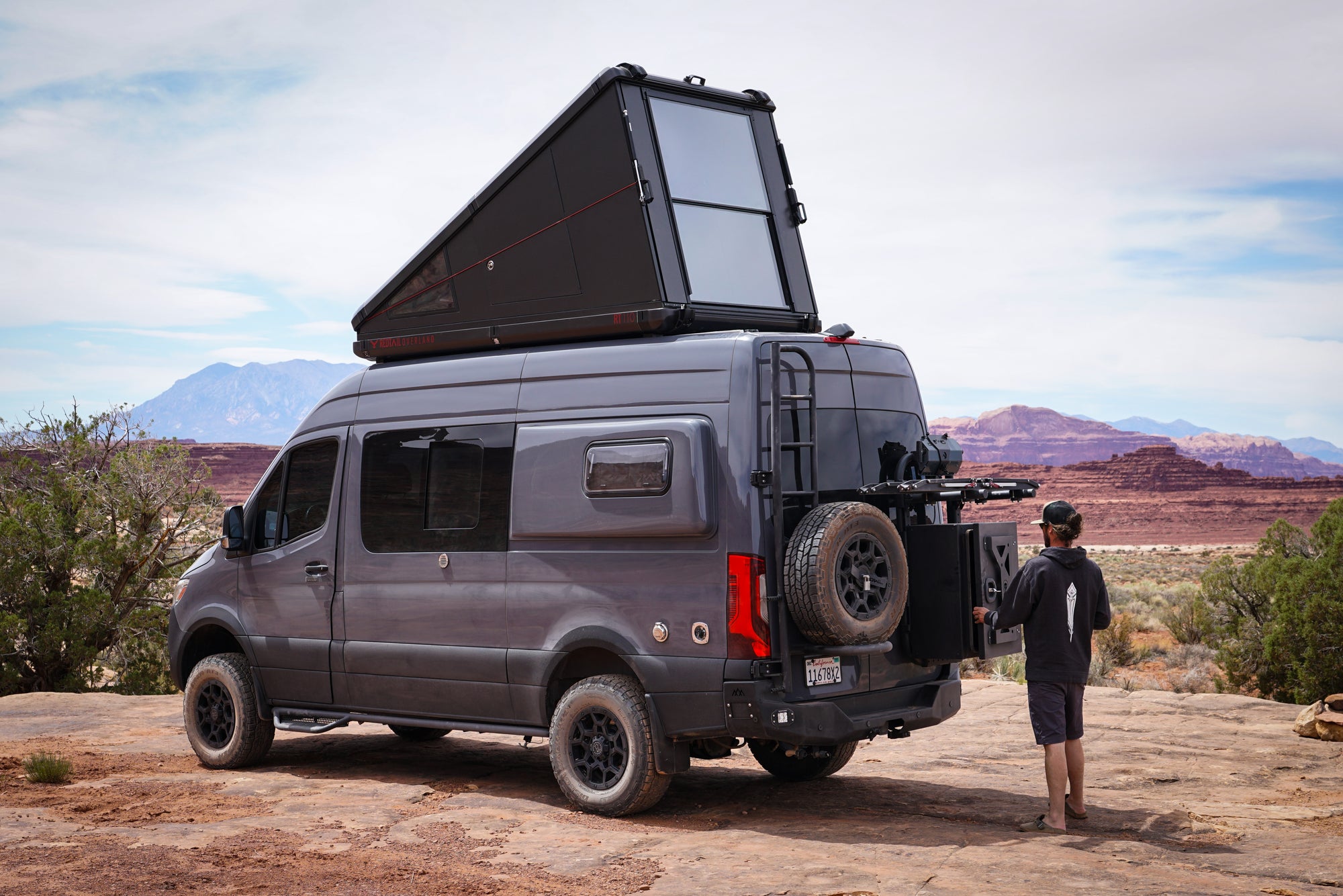 The Skyloft Van features larger all-terrain tires, upgraded suspension, front and rear winches, skid plate, custom front bumper, off-road lighting, onboard air, generous fuel and water capacities, robust off-grid solar and battery systems, bike racks and spacious garage storage for all your gear.